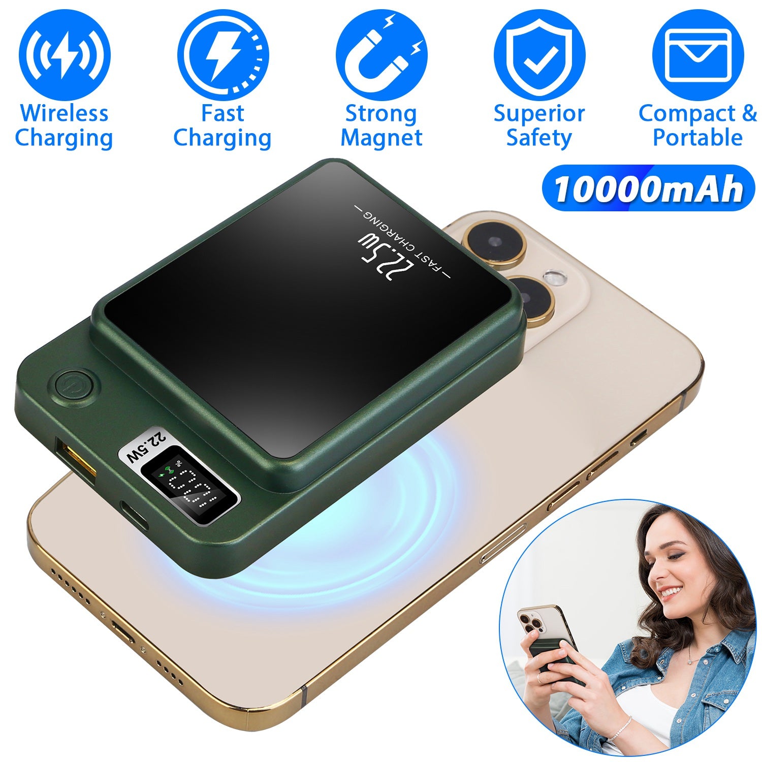 Equipped with 2 fast charging ports and 1 wireless charging port, our 10000mAh power bank features wide compatibility, which fits for IOS Phone 14/14Pro/14Pro Max and other phones confirmed to PD fast charge protocols. Built in powerful magnet, the portable charger is able to hold your device firmly and charge your phone fast. Also come with LCD play, easy to read. Embedded with smart chip, our fast charging power bank protects your device automatically and extends life of battery. Its compact size makes it a perfect companion for home, office and travel.