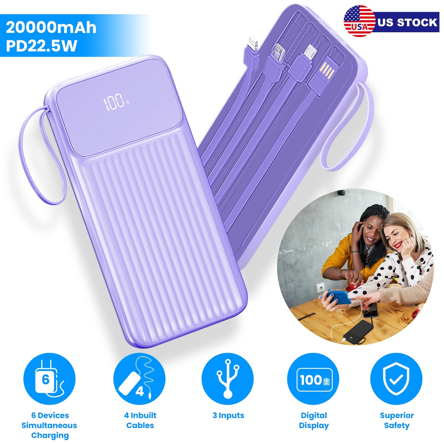Our fast charging power bank provides 20000mAh ultra high power, 4 inbuilt cables and 1 extra Type-C USB cable to ensure the charging of all models of mobile phones, perfect for someone who always on the go. The twin USB ports, 1 Type-C port and 1 Type-C inbuilt cable features PD22.5W fast charging, designed for use with any device confirmed to PD fast charging protocol. Also enable you to share the charging ports with your family or friends up to 6. Advanced circuit and high efficiency power management can protect your electronic devices from over-current and short-circuit. The compact size and portable handle make itself a perfect companion for home, office and travel.