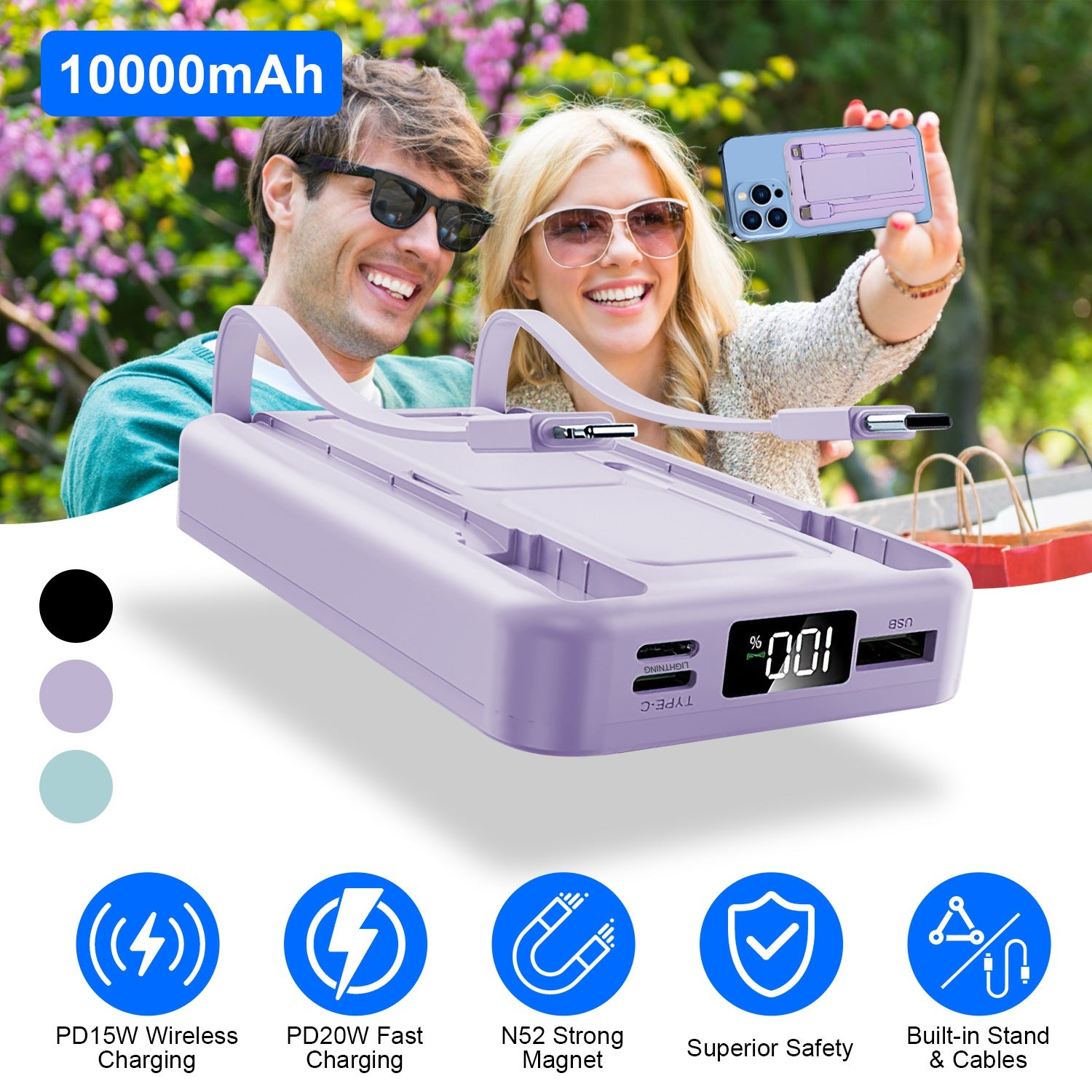 This 10000mAh fast charging power bank charger combines wireless charging and fast charging, allowing you to easily charge your IOS phone, AirPods, iWatches. An ultimate solution for charging. Digital display, easy to use. Offer 1 wireless output port, 1 USB output port, 1 Type-C input & output port, 2 built-in output cables, allowing for charging 5 devices simultaneously. Feature max PD20W power for cable charging and max 15W for wireless charging. The foldable kickstand can function as a mobile phone stand for a comfortable viewing angle when scrolling videos or binge-watching. Built in N52 powerful magnet to hold your device firmly. The upgraded smart chip not only makes the working temperature drop by 40%, but also provides multiple safe protections. Lightweight and compact, a perfect companion for home, office and travel.