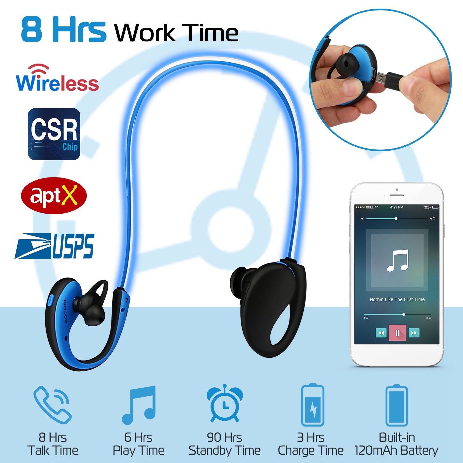 The sport headphones features LED illuminated neckband, advanced V4.1 and crystal clear sound effect, which is perfect for night runner or daytime workout. The two ear hooks adopts skin-friendly materials and ergonomic shape design to ensure secure and comfortable wearing experience. The CSR4.1 chip offers you wonderful sound effect when enjoy music and crystal clear hands-free call with high-sensitive microphone. 120mAh battery can lasts up 6-hrs playing time or 8-hr talking time after fully charged with included USB charging cable.