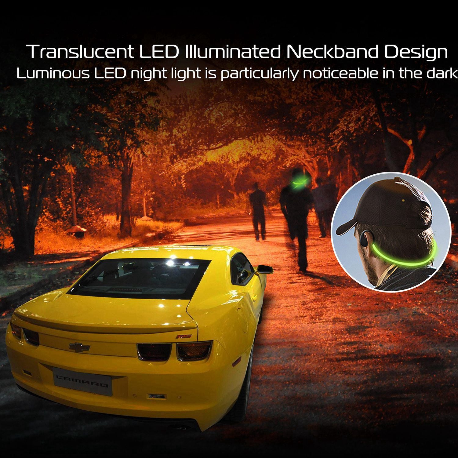 The sport headphones features LED illuminated neckband, advanced V4.1 and crystal clear sound effect, which is perfect for night runner or daytime workout. The two ear hooks adopts skin-friendly materials and ergonomic shape design to ensure secure and comfortable wearing experience. The CSR4.1 chip offers you wonderful sound effect when enjoy music and crystal clear hands-free call with high-sensitive microphone. 120mAh battery can lasts up 6-hrs playing time or 8-hr talking time after fully charged with included USB charging cable.