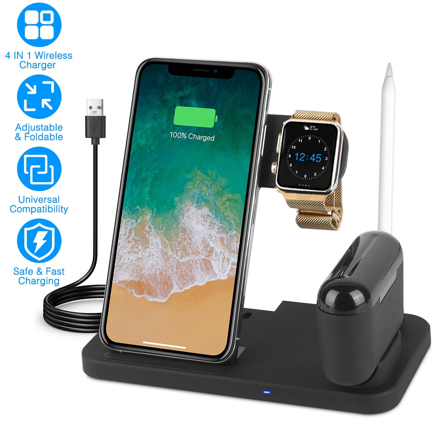 4 In 1 Wireless Charger Foldable Fast Charging Station Stand Dock Fit for iWatch Apple Pencil Airpod 1/2/3/Pro iPhone 13 12 11 Pro Samsung S22 S21 Qi-