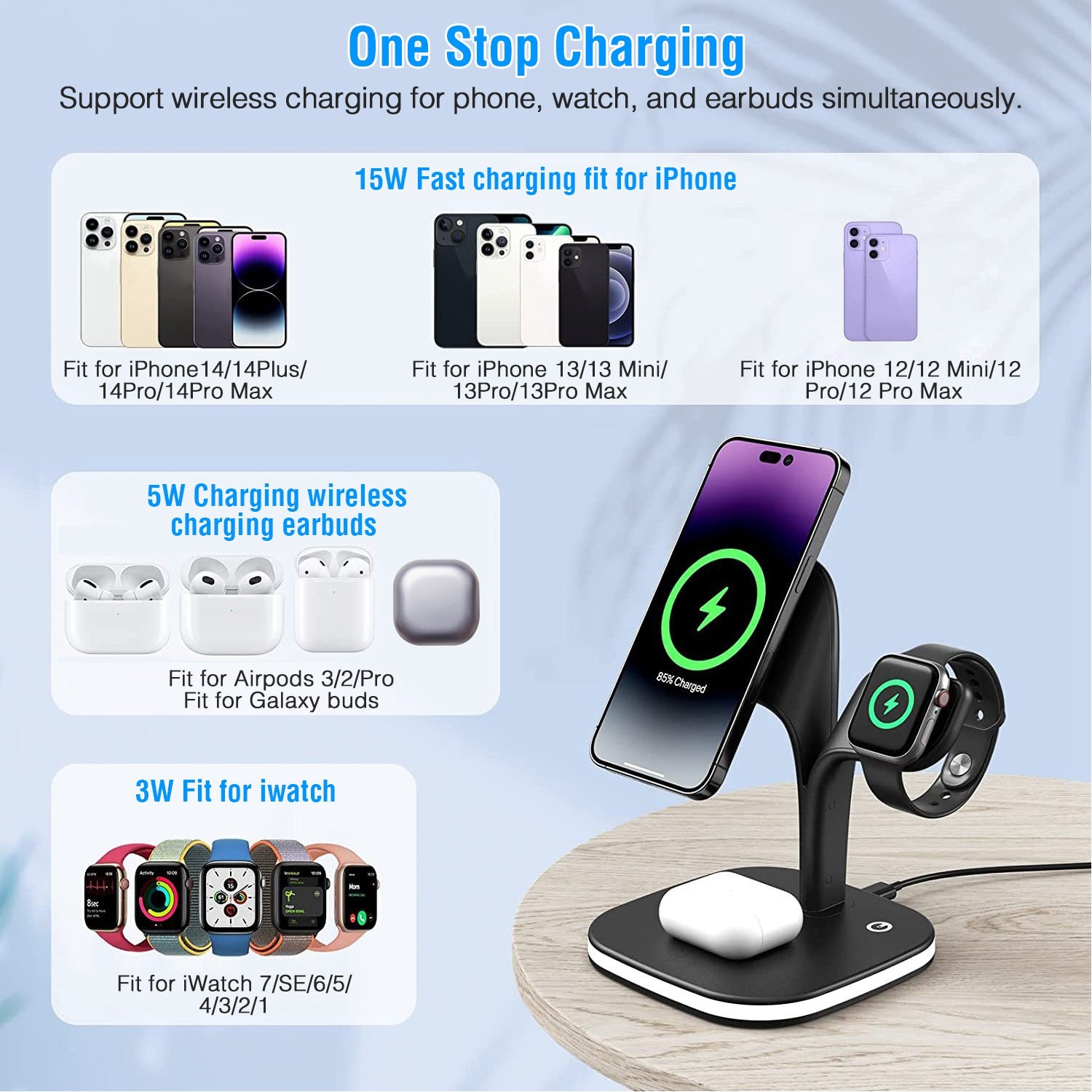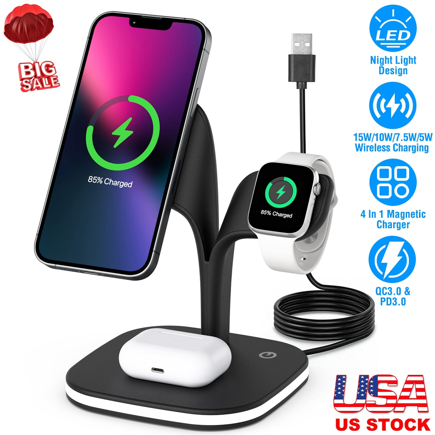 4 in 1 Magnetic Wireless Charging Station Dock Charger 15W Fast Charging Stand Nightlight Fit for iPhone 14 13 12 Pro Pro Max Mini iWatch 7 6 5 4 3 2