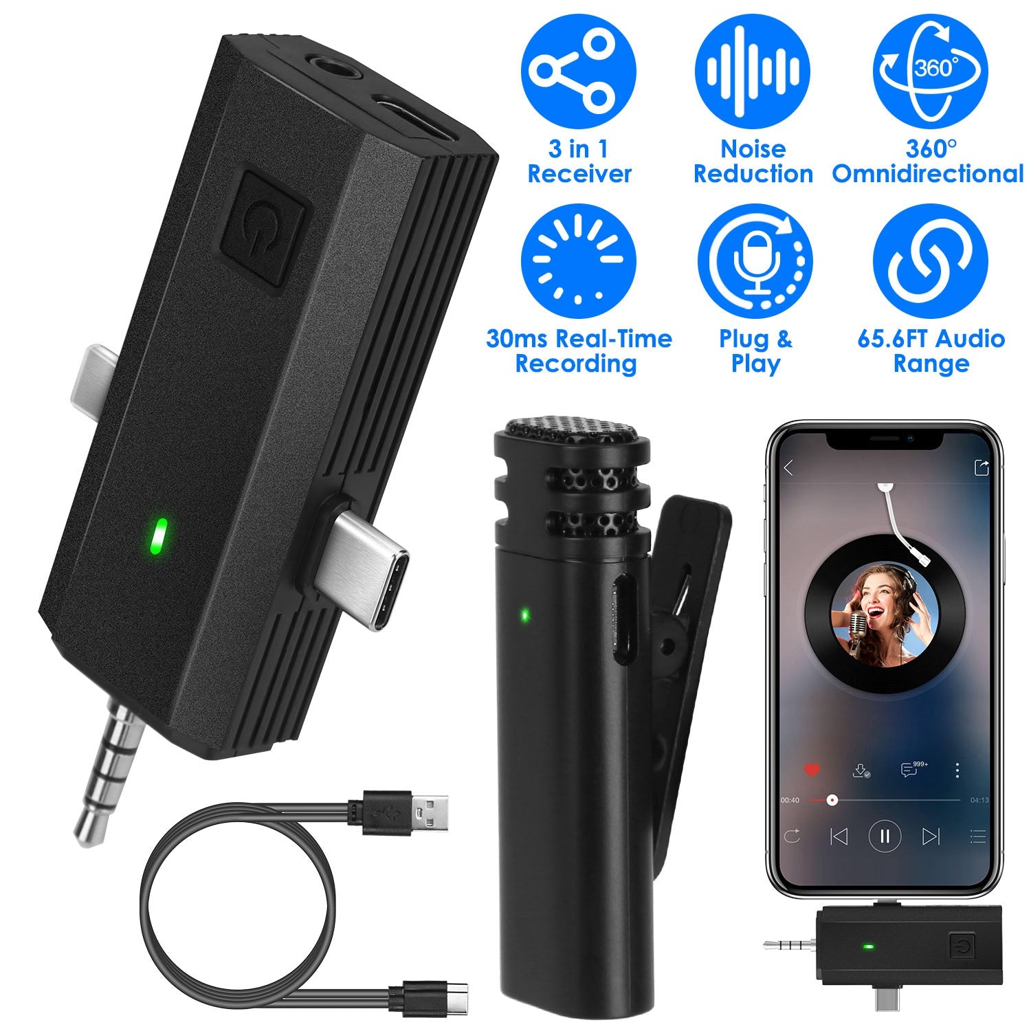 1Pc 3 in 1 Wireless Clip On Microphone Omnidirectional Mic Noise Reduction Plug and Play 65.6FT Transmission Type-C IOS PC Video Record Interview Vlog