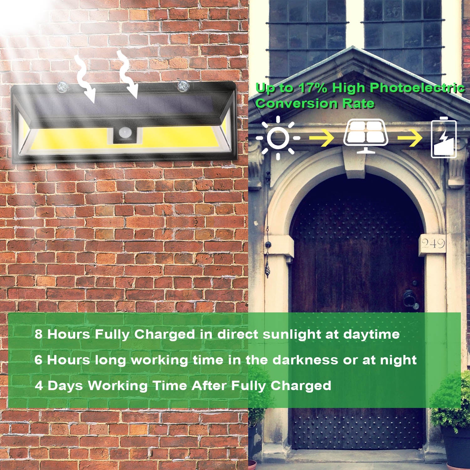 Our Solarek Outdoor Solar Wall Light offers an optimal solution for illuminating at dark night, which features upgraded PIR motion sensor, inbuilt bright 180 COB LEDs, dual 2200mAh rechargeable batteries, IP65 Waterproof and heatproof. It can be easily installed without fear of environmental damage and fully charged about 8 hours under the direct sunlight. During the day the solar light will automatically switch off to save energy; and it will turn on when motion is detected within 8m in darkness or at night, so you can find your way. Use our LED Sensor wall light for your garden, backyard, deck, porch, patio, pond, garage, driveway, pathway or any outdoor location that needs a light.